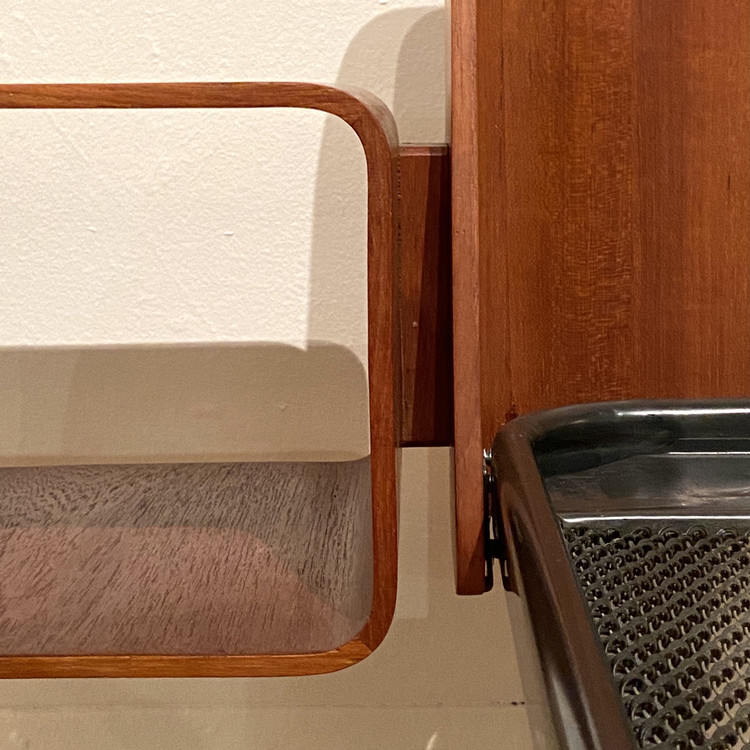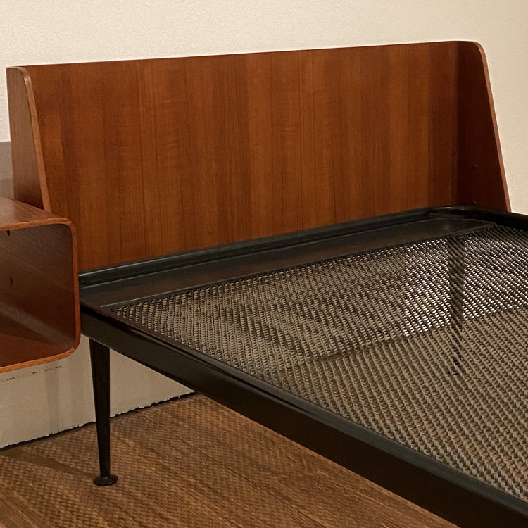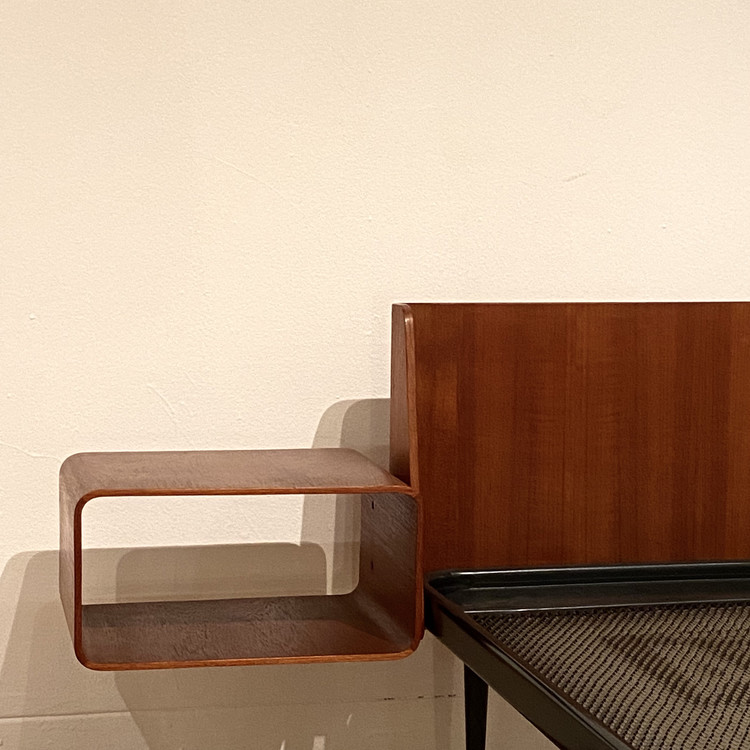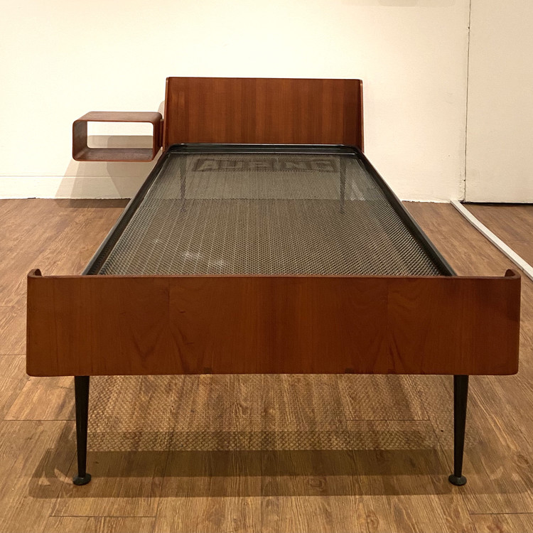 스몰 사이드테이블이 연결되어 있는 1인용 침대와 거울은 프리소 크라머(Friso Kramer)가 네덜란드의 베드스프링 회사인 오핑(Auping)을 위해 1963년에 디자인한 Euroika 시리즈입니다.